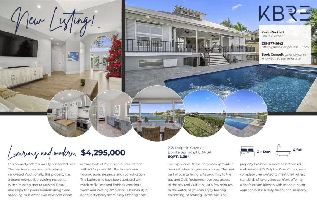 Kevin Bartlett is a seasoned industry expert in Southwest Florida, having established one of the most successful and recognized local real estate firms in the state. His remarkable achievements in real estate and charitable work have earned him numerous prestigious awards. Kevin has also received significant editorial exposure, being featured and acknowledged by both local and national publications for his exceptional real estate accomplishments. Beyond these highlights, Joe offers an extensive marketing program designed to support all your real estate goals.